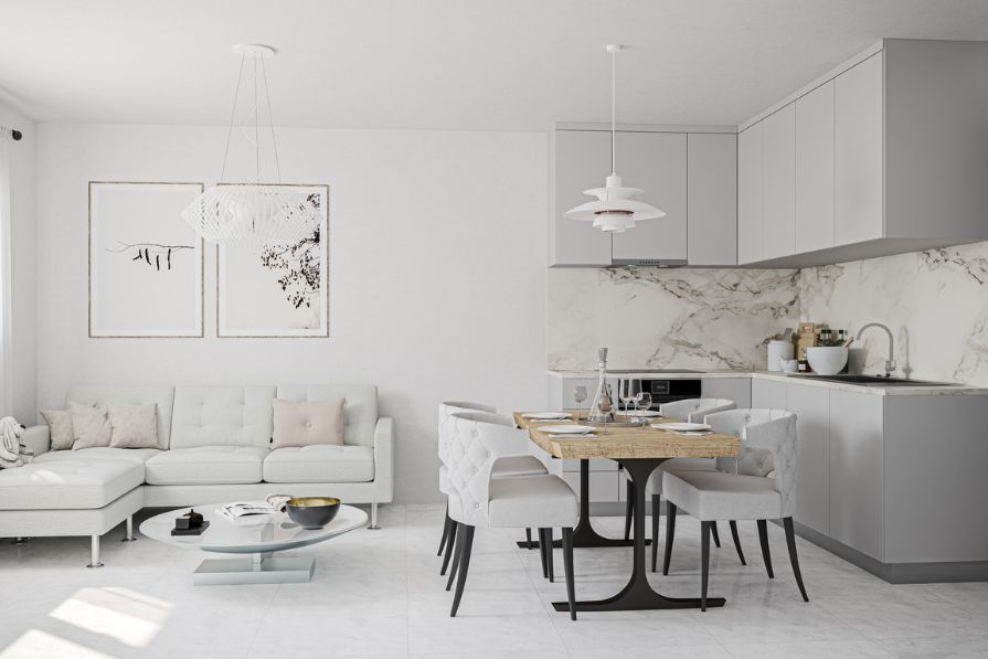 The ground floor features a bright and spacious open-plan layout, combining a modern kitchen, dining area and a comfortable living room. A guest WC is also conveniently located on this level.